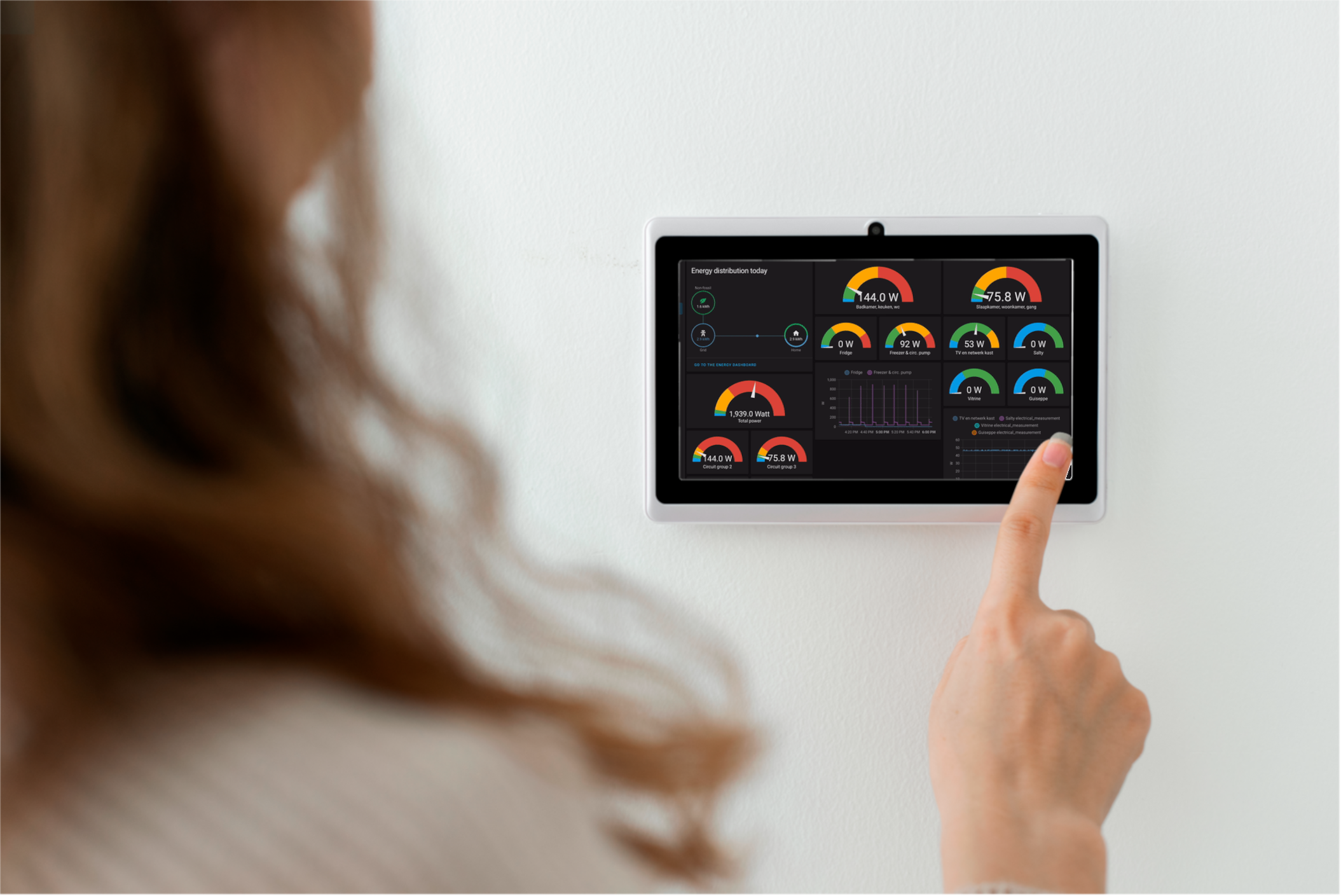 Één van de vele mogelijkheden is bijvoorbeeld om een tablet aan de muur te bevestigen met daarop altijd de status van uw woning, uw energieverbruik of een gegenereerde plattegrond van uw woning.